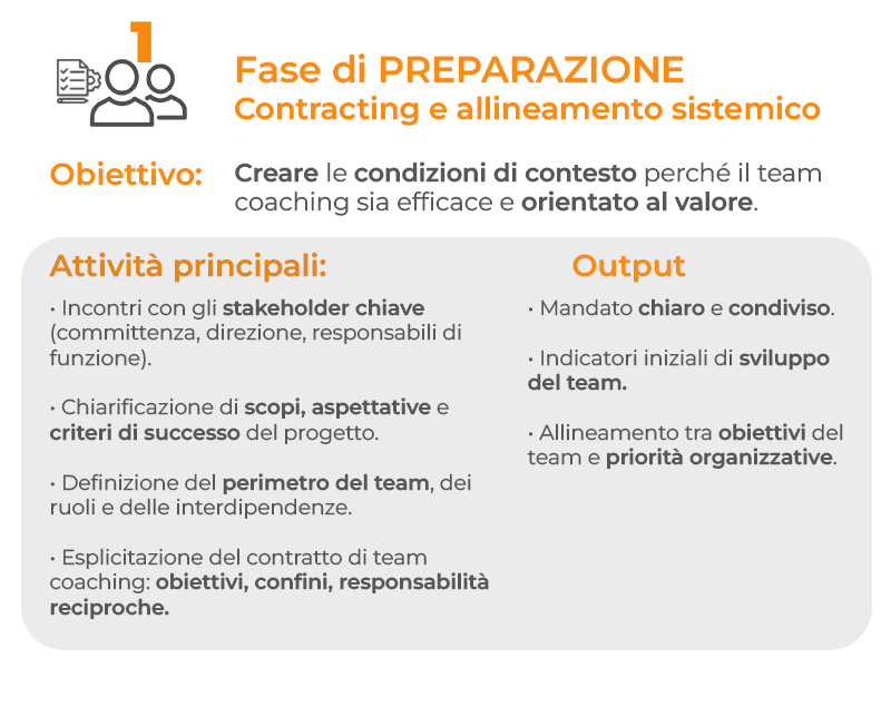 Una volta individuato il o i Team da coinvolgere i Coach concorderanno con il vertice aziendale e con ognuno dei team leader, gli obiettivi attesi e le “regole d’ingaggio” che guideranno i lavori.