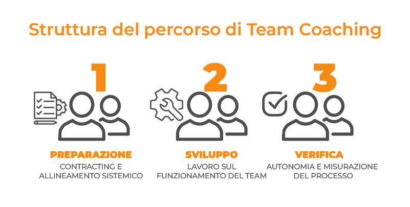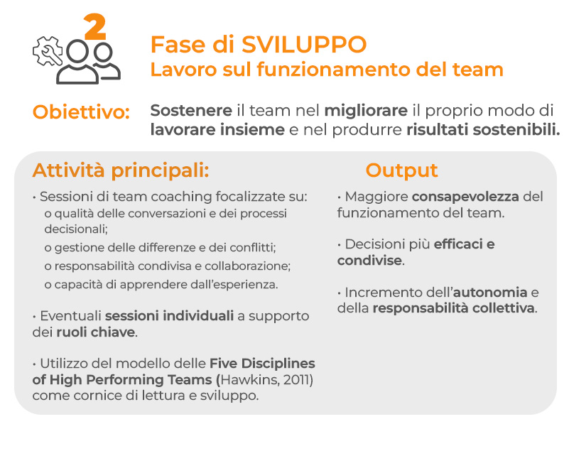 Il percorso si articola in tre fasi evolutive, integrate tra loro, che combinano sessioni individuali e di team, favorendo cicli ricorsivi di dialogo – decisione – azione – riflessione.